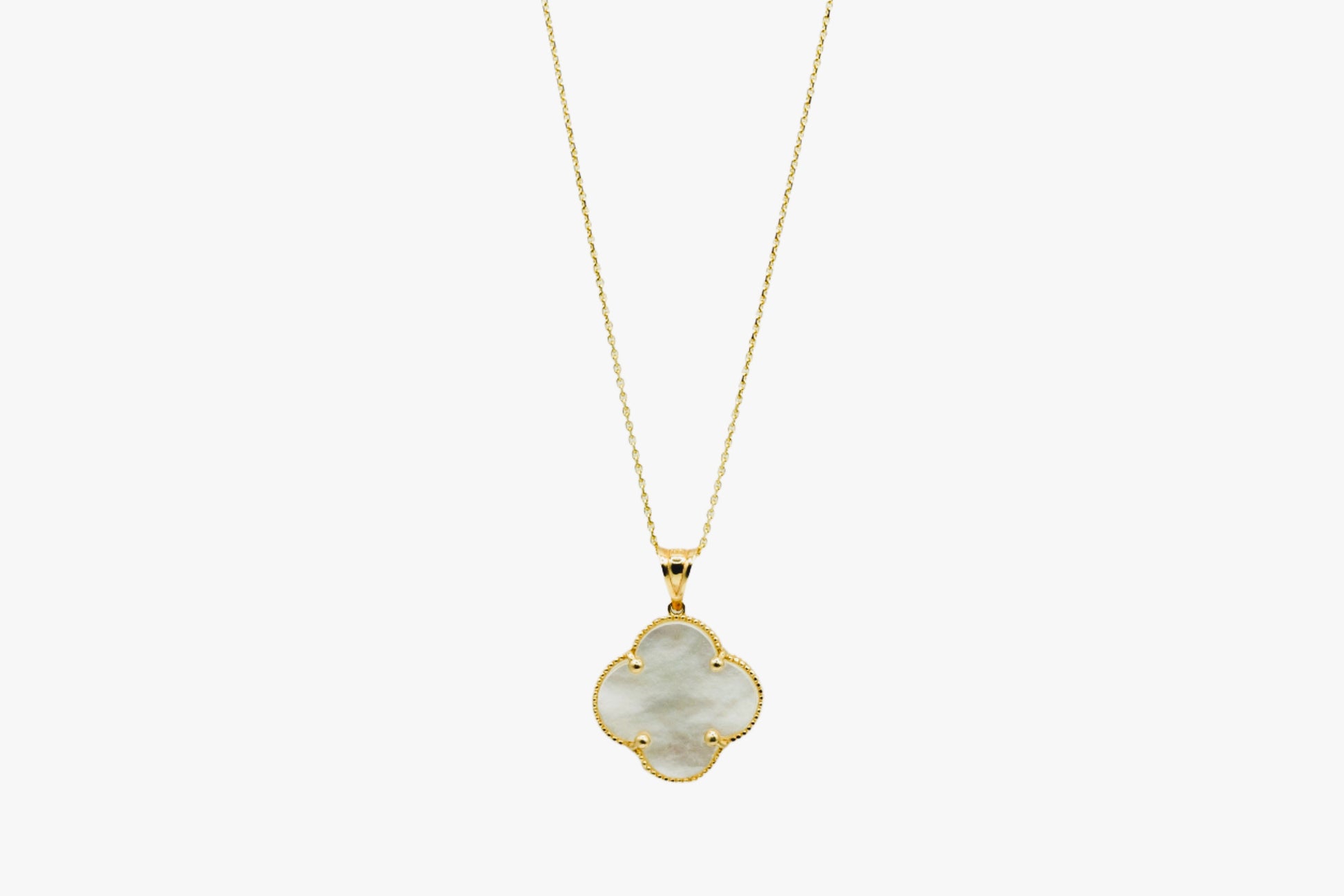 This stunning 14k Gold Mother of Pearl Clover necklace exudes elegance and sophistication. The trendy clover design, made of genuine mother of pearl, embodies good luck and prosperity. Crafted from 14k gold, this necklace is sure to add a touch of luxury to any outfit. (Pendant and chain sold together)