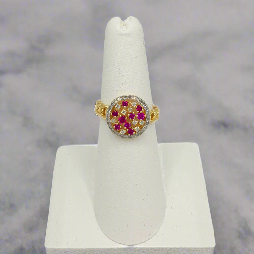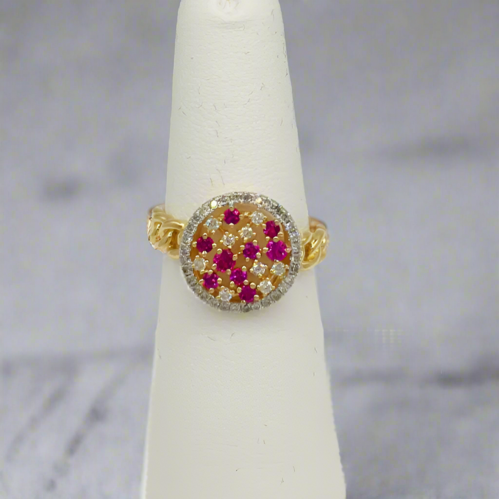 This elegant 14k Ruby and Diamond Circle Ring shines with a deep red ruby and sparkling diamonds. Perfect for adding a touch of glamour to any outfit. Made with high-quality gold and stones, this ring is sure to make a lasting impression.